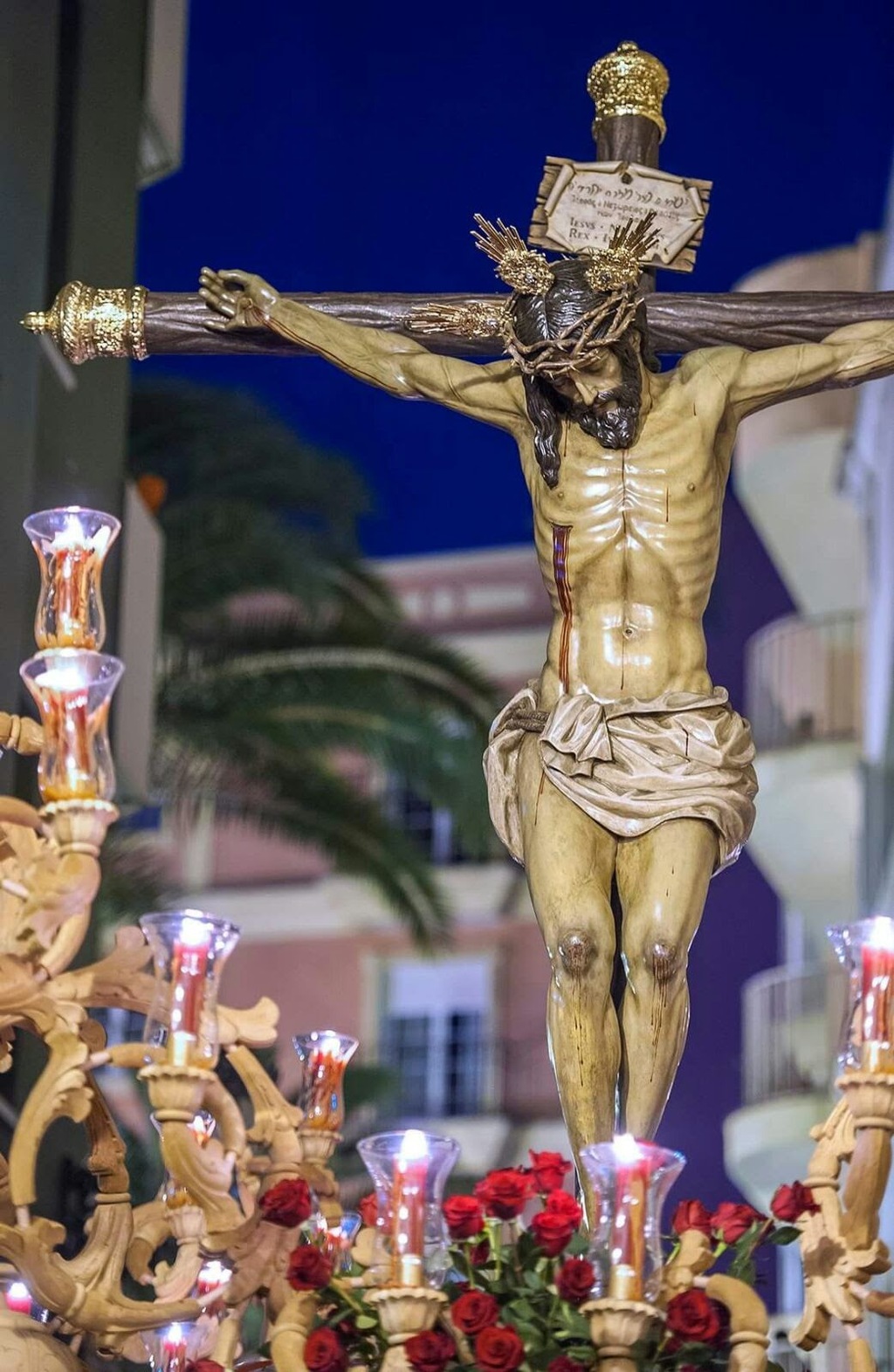 Originalmente, la cruz sobre la que se sustentaba la talla del Cristo era de las denominadas arbóreas, con profusión de nudos y grietas tallados en madera. Sin embargo, tuvo que ser sustituida en la década de 1970 al haber sido gravemente afectada por xilófagos. Desde entonces, la imagen fue presentada sobre una cruz de madera de tipo liso, lo que restaba esbeltez a la figura.
